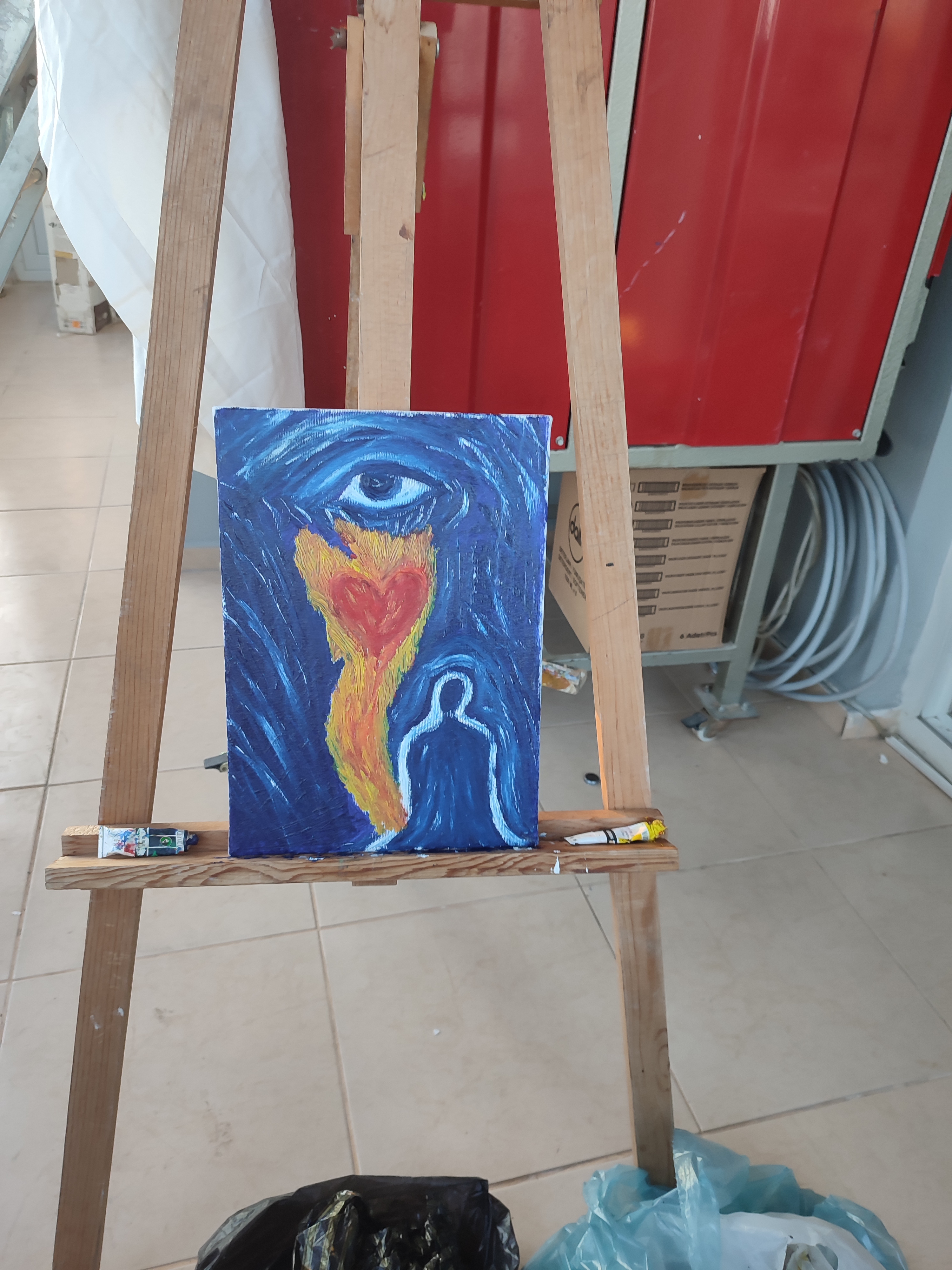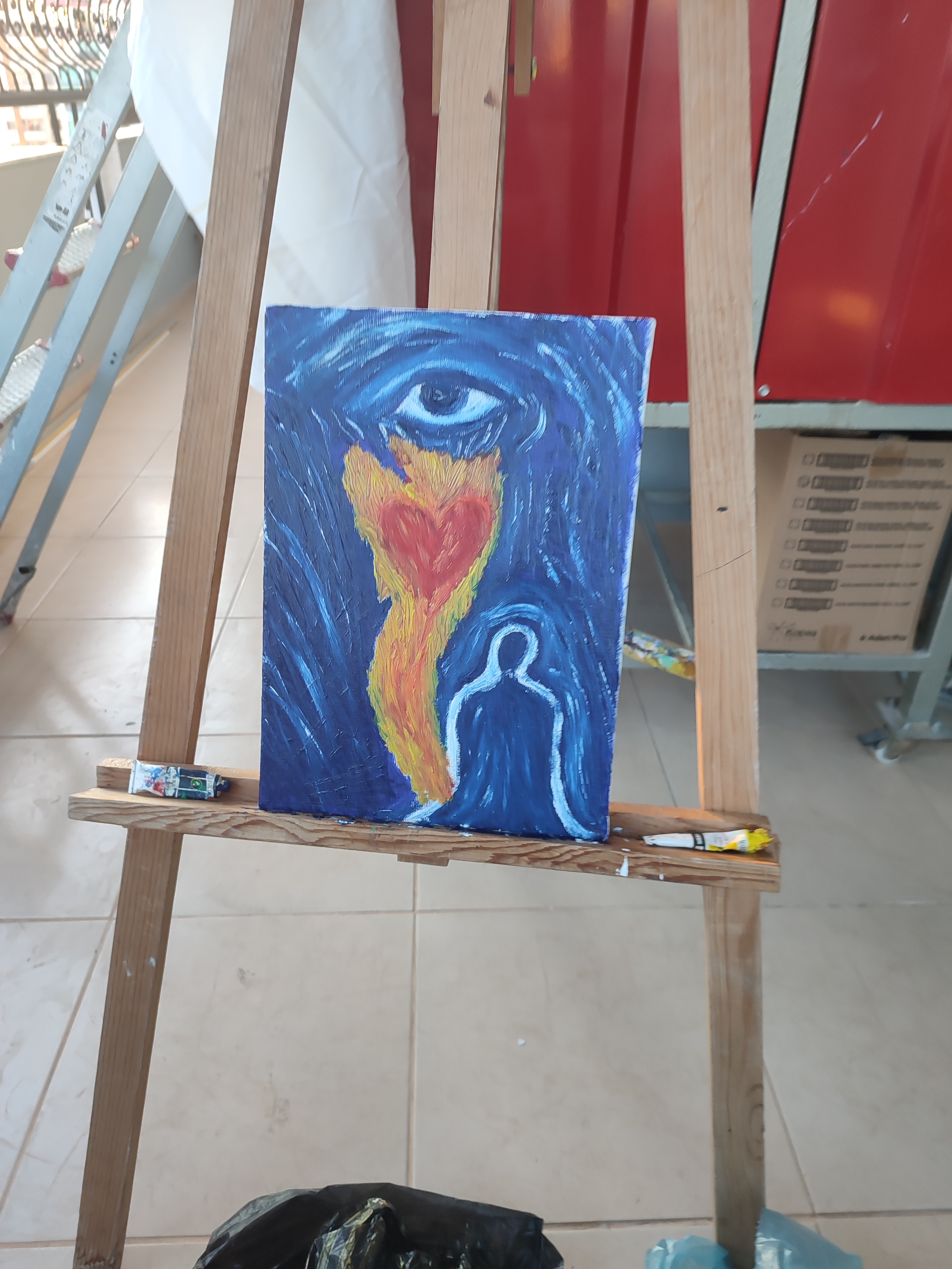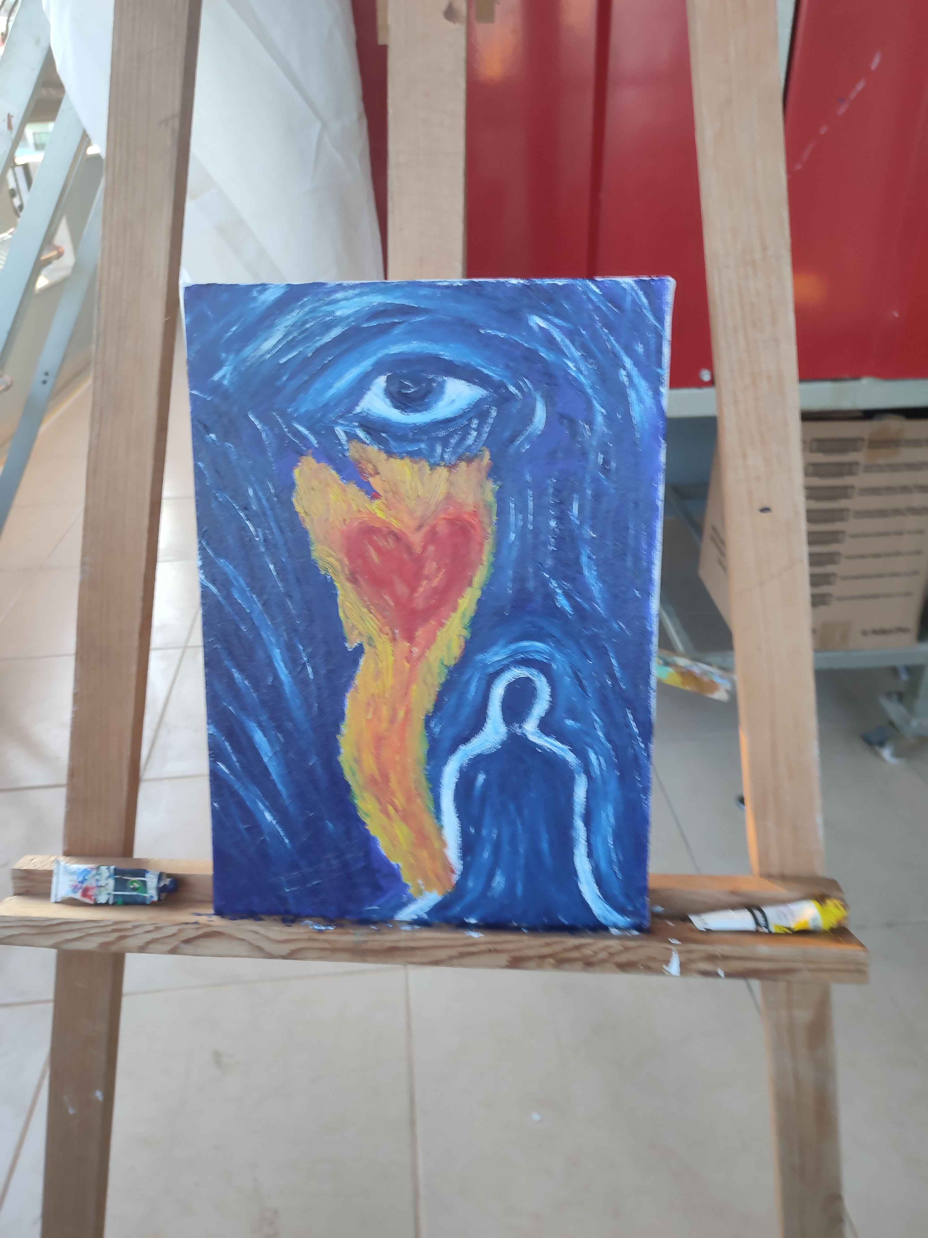 AŞKIN ÜÇ CEMRESİ 25cmx35cm tuval üzerine çerçevesizdir. Bu eser, aşkın görünmeyen yolculuğunu üç aşamada anlatır: Gözden göze geçiş, gözden kalbe akış, kalpten ruha yükseliş. Tablonun üst kısmında yer alan göz, ilk kıvılcımın kaynağıdır. Bir bakış, kelimelerden önce konuşur. Hiç dokunmadan temas eder. İnsanın dışındaki dünya gözden içeri süzülür, ilk titreşim burada başlar. Orta bölümde beliren kalp, duygunun kabullenişidir. Gözden içeri düşen ışık, burada sevgiye, yakınlığa ve teslimiyete dönüşür. Aşk burada artık sadece görülen değil, hissedilen bir varlıktır. Tablonun en altındaki akışkan ruh formu ise aşkın son ve en derin hâlini temsil eder. Kalpten ruha yükselen bu yolculukta, benlik çözülür, sınırlar silinir. Aşk artık bir bedenin, bir kimliğin değil, bir bütünlüğün alanına ulaşır. Bu eser, aşkın bedenden içeri, içten sonsuza doğru yaptığı saklı yolculuğa tanıklık eder.