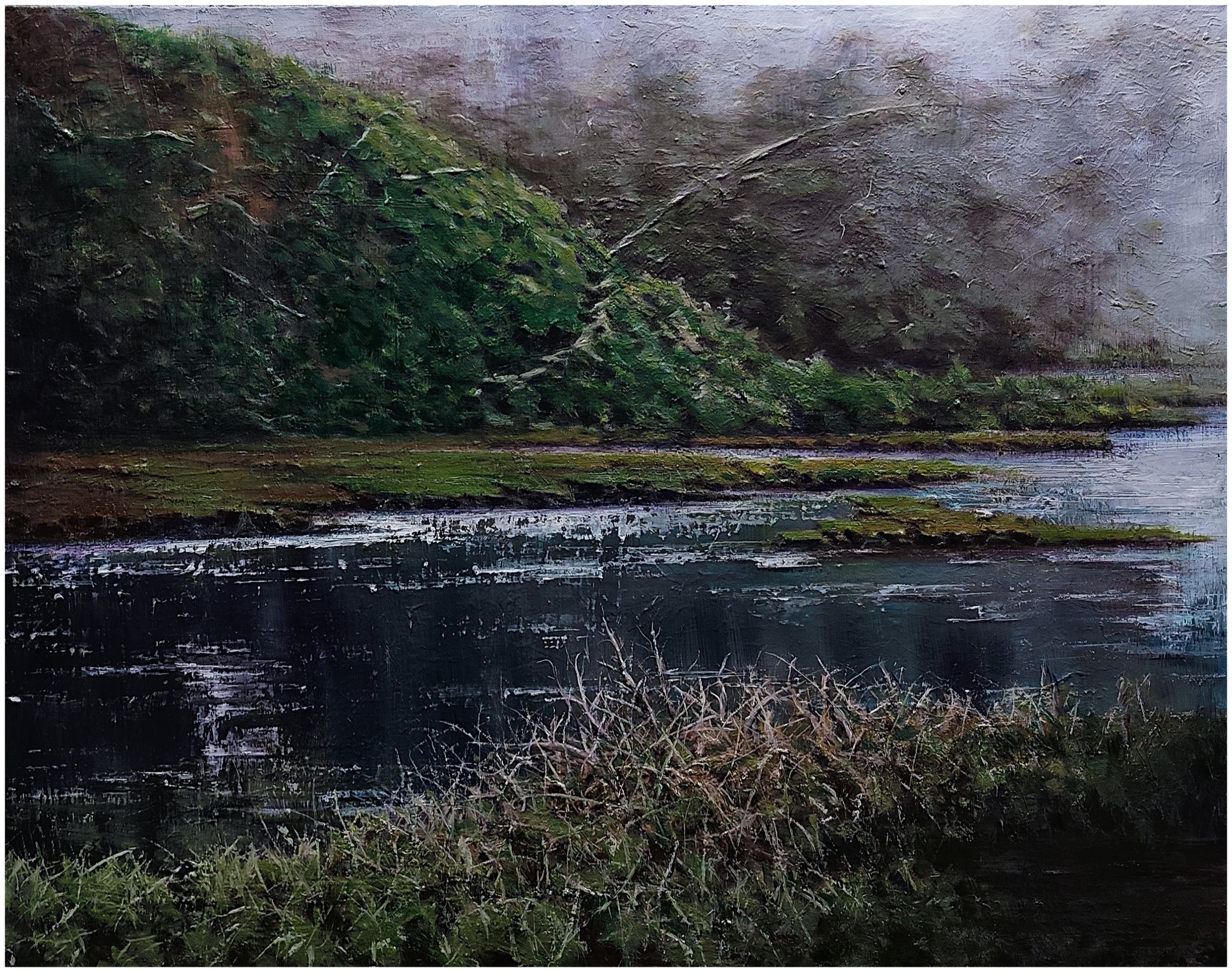 Perspektif: Ön plandaki detaylı otlar ve orta plandaki geniş su kütlesi, izleyiciyi resmin derinliklerine, yani sisli arka plana doğru çeken güçlü bir perspektif yaratır.